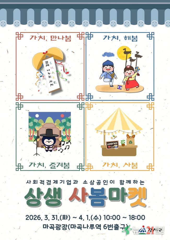 서울 강서구(구청장 진교훈)는 오는 3월 31일부터 4월 1일 이틀간, 오전 10시부터 오후 6시까지 마곡광장(마곡나루역 6번 출구)에서 ‘2026 사회적경제기업·소상공인 상생 사봄마켓’을 개최한다.