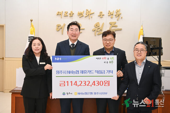 원주시는 지난 24일 시청에서 원강수 시장, 김주석 NH농협 원주시지부장 등이 참석한 가운데 NH농협 제휴카드 적립금 전달식을 가졌다.