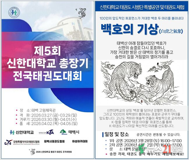 아울러 대회 기간 중에는 신한대학교 태권도 시범단이 3월 28일과 4월 2일 오후 4시 태백 문화광장에서 ‘백호의 기상’을 주제로 역동적인 공연을 선보인다. 이와 함께 송판 격파 체험과 태권도 기본 동작 배우기 프로그램도 운영돼 시민과 관광객 모두가 함께 즐길 수 있는 참여형 행사로 마련된다.