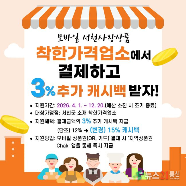 이번 사업에 따라 착한가격업소에서 모바일(카드) 서천사랑상품권으로 결제할 경우, ‘지역사랑상품권 Chak’ 앱을 통해 결제금액의 3%를 추가 캐시백으로 지원받을 수 있다.