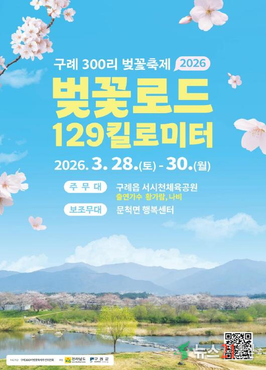 구례군은 전국 최장 129㎞ 벚꽃길을 배경으로 한 ‘2026 구례300리 벚꽃축제’를 3월 28일부터 30일까지 3일간 서시천체육공원과 문척면 행복센터 일원에서 개최한다.