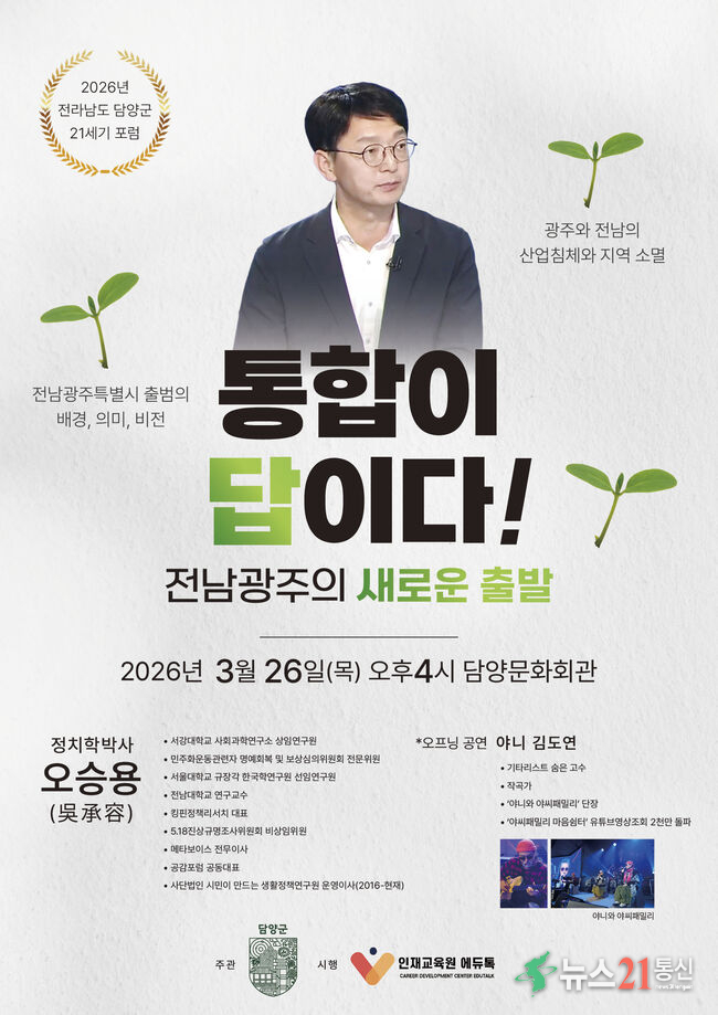 담양군이 오는 3월 26일 담양문화회관에서 ‘제192회 21세기 담양포럼’을 개최한다.