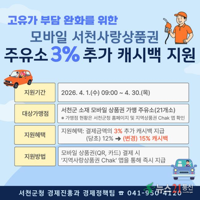 지원 대상 가맹점은 서천군 관내 21개 주유소로, 해당 주유소에서 모바일 서천사랑상품권으로 결제할 경우 ‘지역사랑상품권 Chak’ 앱을 통해 결제금액의 3%를 추가 캐시백으로 지급한다.