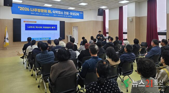 [뉴스21 통신=이준범 ]전남 나주시가 ‘2026 나주방문의 해’를 맞아 관내 숙박업소의 친절도와 위생 수준을 높이기 위한 통합 교육을 실시하고, 관광객들이 ‘다시 찾고 싶은 나주’를 만드는 데 본격적으로 나섰다.나주시는 지난 1일 나주시보건소에서 관내 70개 숙박업소 관계자 90여 명이 참석한 가운데 ‘숙박업소 친절&middo...