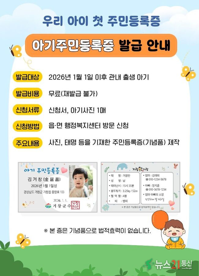 [뉴스21 통신=김희백 사회2부기자] 거창군은 소중한 아기의 출생을 기념하고 출산 장려를 위한 사회적 분위기를 조성하기 위해, 지난 2025년부터 시행 중인 ‘아기 주민등록증’ 무료 발급 서비스를 올해도 지속 추진하고 있다고 2일 밝혔다. ‘아기 주민등록증’은 실제 주민등록증과 같은 크기로 제작되며, 앞면에는 이름과 생년...