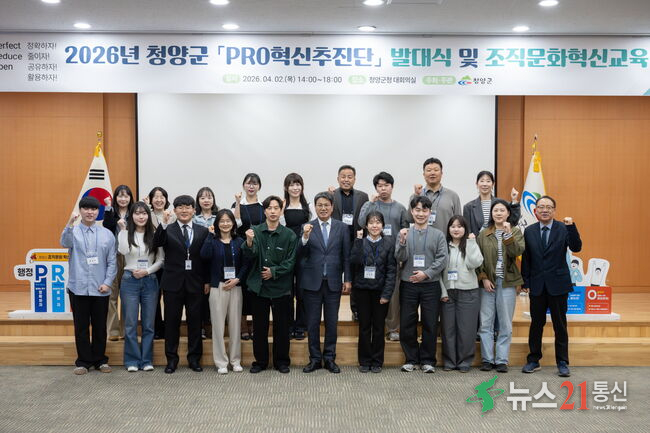 ▲지난 2일, PRO혁신추진단 발대식 참석자들이 단체 기념 촬영을 하고 있다./사진제공=청양군청[뉴스21 통신=이준상 ] 청양군이 조직문화 개선과 인공지능 기반 행정 혁신을 이끌 ‘PRO혁신추진단’을 출범하고 실행 중심의 혁신 행정에 나섰다.청양군은 지난 2일 군청 대회의실에서 김돈곤 군수 주재로 ‘2026년 PRO혁신추진단 발대식&r...