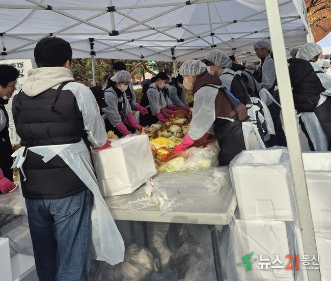 행사장은 일찍부터 분주했다. 흰 위생 앞치마와 모자를 착용한 봉사자들이 한 줄로 늘어서 배추에 양념을 정성껏 바르고, 완성된 김치를 스트로폼 박스에 차곡차곡 포장해 나르는 모습이 인상적이었다. 봉사자들의 밝은 표정과 활기찬 목소리, 서로를 돕는 따뜻한 손길에서 추위조차 잊은 열정이 묻어났다.