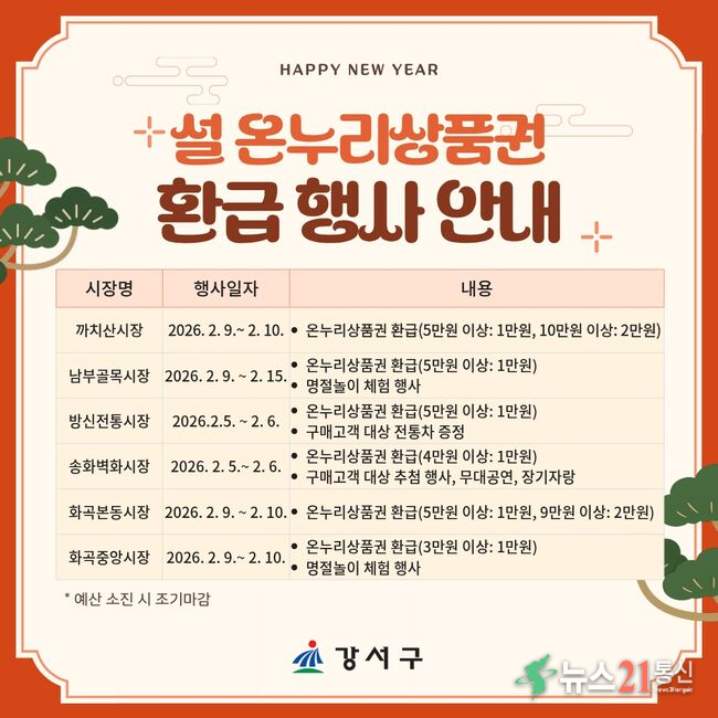 “설 명절 맞아 전통시장에서 장 보시고 온누리상품권도 받아 가세요” 서울 강서구(구청장 진교훈)는 설 명절을 맞아 전통시장에서 ‘온누리상품권 환급행사’와 전통 놀이 체험 등 다양한 행사를 개최한다. 이번 행사는 명절 장바구니 부담을 덜고, 전통시장 소비를 촉진하기 위해 마련됐다. 전통시장 이용객은 일정 금액...