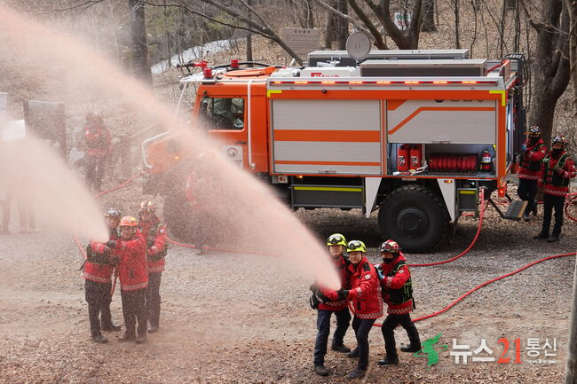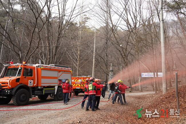 이날 김인호 산림청장은 세계문화유산인 영월 장릉을 대상으로 직접 산불지연제 예방 살포 훈련에 참여하며 산불 현장 대응 능력을 점검했다.