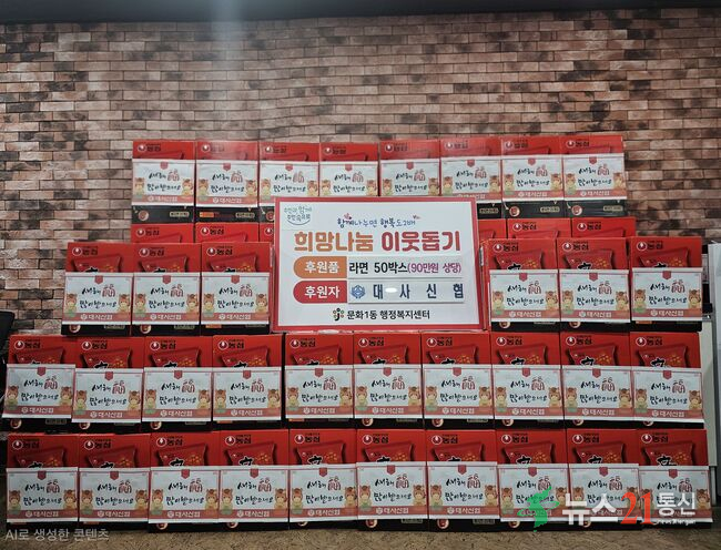 '대사신협, 문화1동 행정복지센터에 설맞이 라면 50박스 후원- 매년 명절마다 꾸준한 나눔 실천 -대전 중구 문화1동(동장 김선희)은 지난 12일 대사신협(이사장 인세종)에서 설 명절을 맞아 지역 내 어려운 이웃을 위해 라면 50박스(90만 원 상당)를 후원했다고 밝혔다.대사신협은 매년 명절마다 꾸준히 후원을 이어오며 지역사회 나눔문화 확...