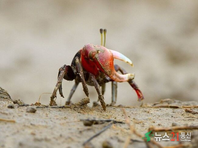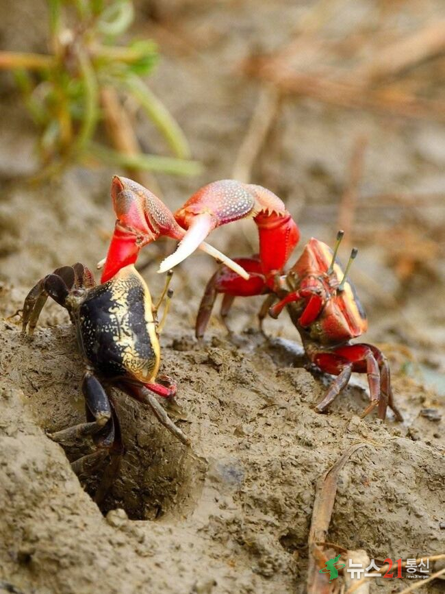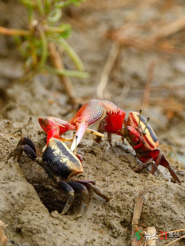 갯벌에서 서식하는 **게**는 주로 진흙이나 모래 속에 굴을 파고 생활한다.