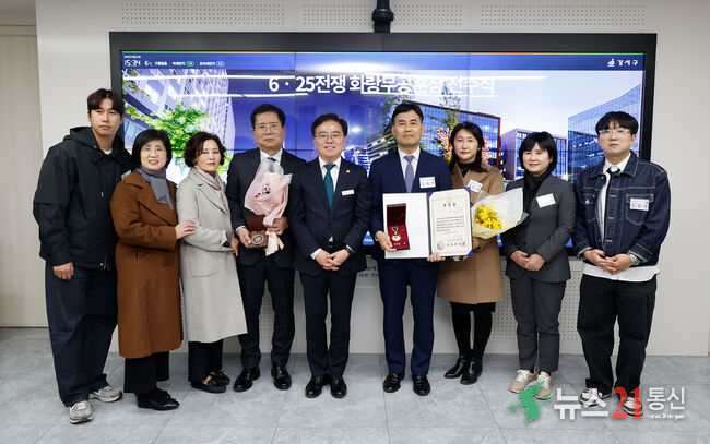 서울 강서구(구청장 진교훈)는 23일(월) 6.25전쟁 참전 유공자 고(故) 김명진 병장의 유족에게 화랑무공훈장을 전수했다. 강서구는 이날 구청장실에서 고인의 자녀와 며느리, 손주 등 유족 8명이 참석한 가운데 전수식을 열었다. 전수식은 국방부와 육군에서 추진 중인 ‘6.25전쟁 무공훈장 찾아주기 사업’의 일환으로 마련됐다. ...
