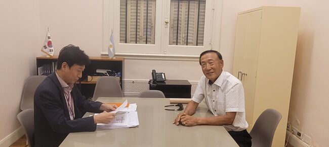 (주아르헨티나 대한민국대사관 허인수영사와 진대섭진상조사추진위원장)