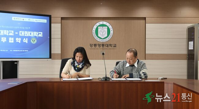 대원대학교와 강릉영동대학교 관계자가 전문대학혁신지원사업의 성공적 추진을 위한 업무협약(MOU)을 하고 있다.대원대학교가 전문대학혁신지원사업의 성과확산과 내실 있는 운영을 위해 타 대학과의 협력 네트워크를 본격 확대하고 나섰다.