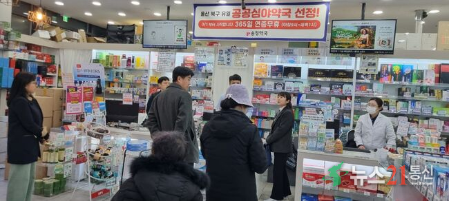 운영에 앞서 울산시와 북구보건소는 지난 2월 24일 송정약국을 방문해 365일 연중 무휴 운영을 위한 인력 활용 방안, 공공심야약국 누리집 관리, 주민 복약 상담 등을 점검했다.