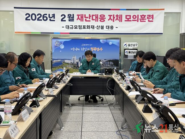 울산 남구(구청장 서동욱)는 26일 재난대응 역량 강화를 위해 ‘2월 재난대응 자체 모의훈련’을 남구청 재난안전상황실에서 실시했다.