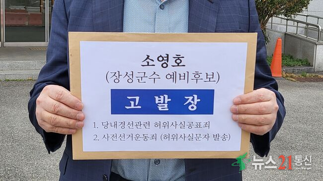 [전남 장성=서민철 기자]더불어민주당 장성군수 경선이 초반부터 ‘고발전’으로 얼룩지고 있는 가운데, 소영호 예비후보가 당내 경선과 관련한 ‘허위사실 공표’ 및 ‘사전선거운동’ 혐의로 장성군 선거관리위원회에 전격 고발 당했다. 2026년 3월 30일 접수된 고발장에 따르면, 소 후보는 당선될 목적으로 불특정 군민들에게 당헌·당규와 다른 왜곡된 정보를 유포한 혐의를 받고 있다.