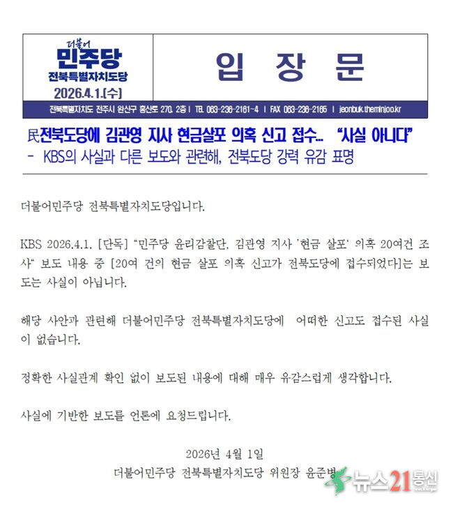 김 지사 측이 특히 강하게 반발하는 대목은 일부 보도에서 제기된 ‘전북도당 신고 20여 건 접수’ 표현이다. 민주당 전북도당은 이날 공식 입장문을 내고 “관련 보도는 사실이 아니고, 정확한 사실관계 확인 없이 보도돼 매우 유감스럽다”며 “도당은 어떠한 신고도 접수된 사실이 없다”고 밝혔다.