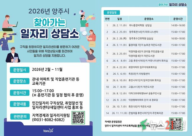양주시가 구직 현장의 문턱을 낮추고 시민들의 취업 성공률을 높이기 위해 오는 11월까지 ‘2026년 찾아가는 일자리 상담소' 를 운영한다. 이번 사업은 시간적·지리적 제약으로 일자리센터 방문이 어려운 시민들을 위해 마련됐다. 전문 직업상담사가 관내 주요 아파트 단지와 직업훈련기관을 직접 찾아가 1:1 맞춤형 상담을 제공하.