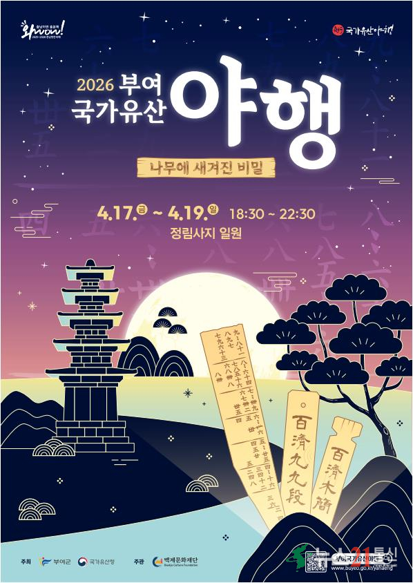 ▲ 2026 부여 국가유산 야행 포스터충남 부여군이 오는 4월 17일부터 19일까지 정림사지 일원에서 열리는 부여 국가유산 야행의 공식 포스터를 공개했다.이번 포스터는 사비 백제 시기의 기록문화인 ‘목간(木簡)’을 모티브로 ‘나무에 새겨진 비밀’이라는 주제를 담아 디자인됐다. 나무에 글을 새겨 기록을 남기던 백...