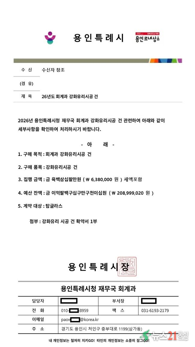 용인특례시(시장 이상일)는 공공기관 직원을 사칭해 업체로부터 대금을 챙기거나 선결제를 유도하는 사기 사건이 발생하자 각별한 주의를 당부하며 피해 예방을 위해 행정력을 집중하고 있다고 17일 밝혔다.앞서 1월 28일 신원 미상의 일당이 지역 내 정보통신업체에 접근해 수지구청 소속 ‘이OO 주무관(가명)’을 사칭했다. 이들은 위...