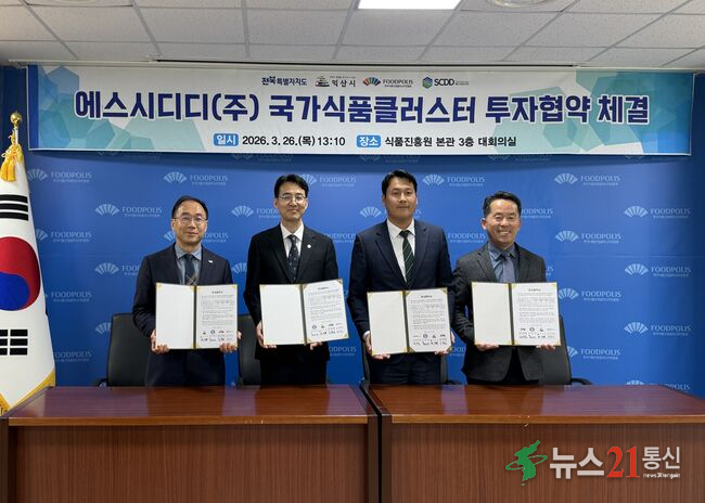 익산시가 국가식품클러스터 입주기업의 세 번째 투자를 이끌어내며, 기업 성장과 재투자가 이어지는 산업 생태계 구축에 속도를 내고 있다. 익산시는 26일 국가식품클러스터 입주기업 '에스시디디㈜(대표 강병수)'와 국가식품클러스터 내 제3공장 건립을 위한 투자협약을 체결했다. 에스시디디㈜는 김을 생산하는 식품기업으...