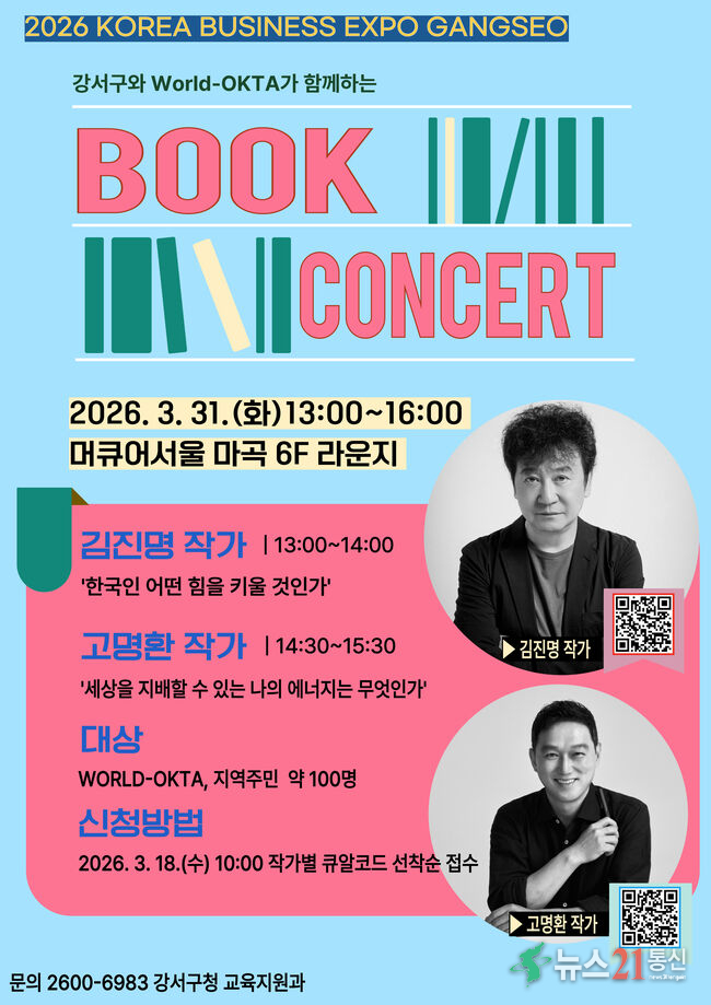 서울 강서구(구청장 진교훈)는 오는 3월 31일 13시 머큐어서울 마곡(강서구 마곡중앙로 143) 6층 라운지에서 ‘사단법인 세계한인경제무역협회(이하 월드옥타)와 함께하는 북 콘서트’를 개최한다고 밝혔다. 이번 행사는 오는 3월 30일부터 4월 2일까지 코엑스 마곡에서 진행되는 ‘2026 한국 비즈니스 엑스포 강서(KOREA BUSINESS EXPO GANGSEO)&...