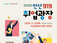 안산시(시장 이민근)는 오는 20일 ‘2025년 11월 안산 919취업광장’을 안산올림픽기념관 체육관에서 개최한다고 5일 밝혔다.이번 ‘안산 919취업광장’은 안산시일자리센터와 지역 일자리 유관기관이 협업해 진행하는 올해의 마지막 채용행사다.시는 인력난을 겪고 있는 기업체에 우수 인력을 지원하고 취업을 희망하는 구직자에.