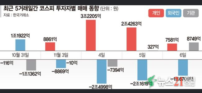 NH투자증권 N 연구원은 "마이클 버리(영화 '빅쇼트' 실제 인물로 알려진 헤지펀드 매니저)가 엔비디아·팔란티어 하락에 베팅했다는 소식까지 더해지며 밸류 부담 심리가 커진 상황"이라며 "10월 한 달간 코스피가 19.9% 상승한 만큼 차익실현 매물이 예상보다 크게 출회된 것"이라고 진단했다.