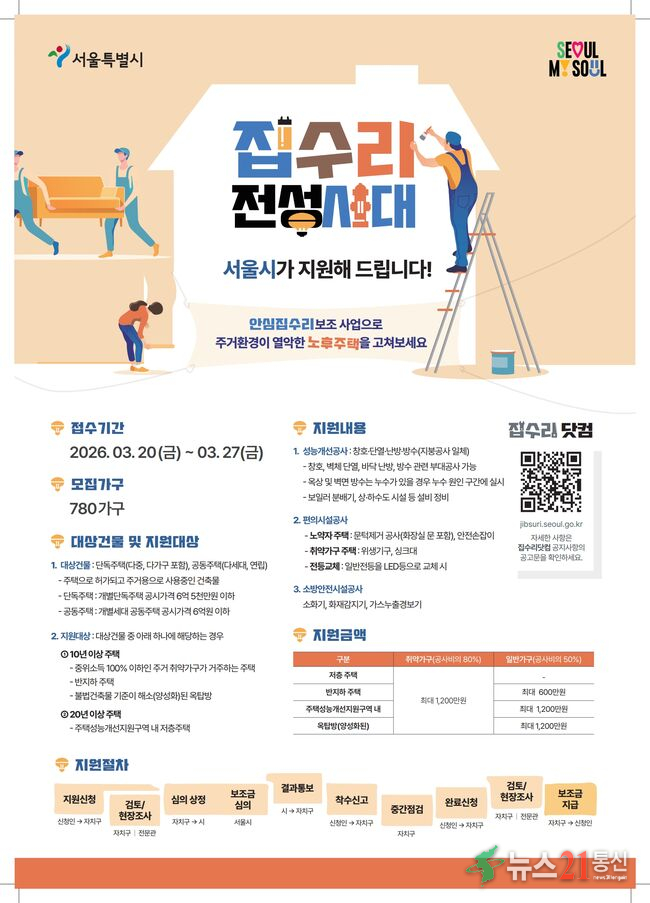 서울 강서구(구청장 진교훈)는 노후주택 거주자의 주거환경 개선을 위해 집수리 공사비 일부를 지원하는 ‘안심 집수리 보조사업’을 추진한다. 지원 내용은 ▲내부 성능개선(단열·방수·창호·설비) ▲편의시설 설치(내부 단차 제거·안전 손잡이) ▲소방안전 시설 설치(소화기·화재감지기·가스누출경보..