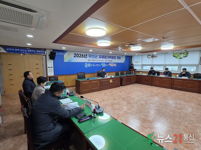 [뉴스21 통신=박철희 ] 무안군(군수 김산)은 11일 군청 상황실에서 군정 주요 업무 성과관리를 위한 자체평가위원회를 열고 2025년 자체평가 결과를 점검하고 2026년 평가 계획을 논의했다.자체평가위원회는 대학교수와 민간 전문가 등 10명으로 구성돼 있으며, 군정 주요 업무에 대한 평가 방향 설정, 평가계획 수립, 평가 결과 심의 등의 역할을...