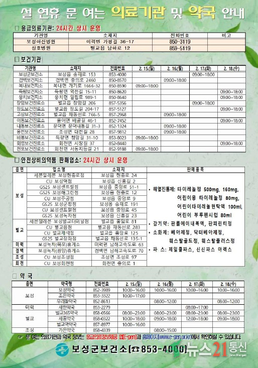 [뉴스21 통신=박철희 ] 보성군은 오는 14일부터 5일간 이어지는 설 연휴 기간 동안 군민과 귀성객이 안전하고 편안한 명절을 보낼 수 있도록 종합상황실을 중심으로 비상근무 체계를 가동하고 분야별 종합대책을 추진한다고 밝혔다.군은 연휴 기간 군청과 읍·면, 주요 시설을 포함해 총 8개 대책반을 운영한다. 교통·물가·연료..