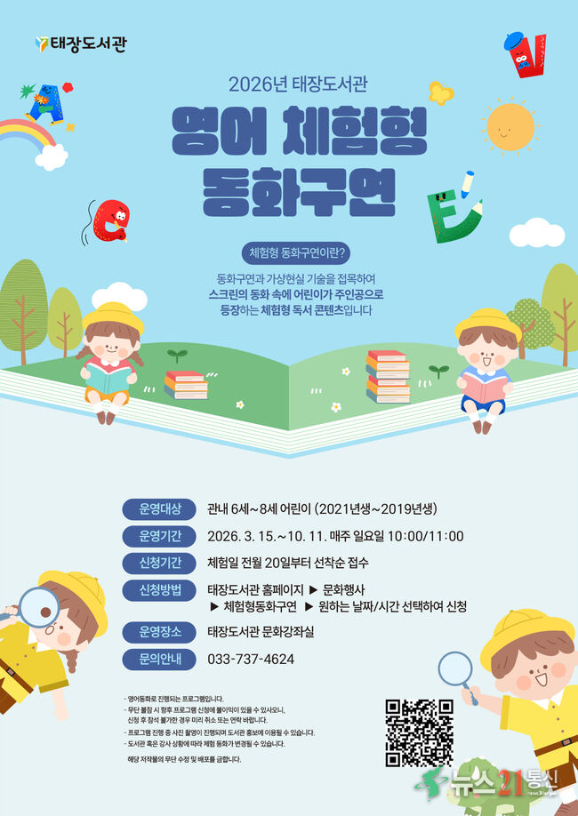 원주시 태장도서관은 올해 신규 프로그램으로 오는 3월부터 6∼8세 어린이를 대상으로 한 ‘영어 체험형 동화구연’을 운영한다.