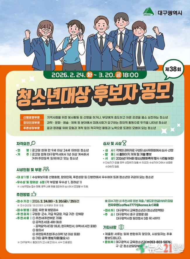 대구광역시는 건강하고 바른 성장으로 지역사회의 귀감이 된 청소년을 발굴·포상하기 위해 ‘2026년 제38회 대구광역시 청소년대상’ 후보자를 2월 24일부터 3월 20일까지 공개 모집한다.1989년 첫발을 내디딘 ‘청소년대상’은 건강하고 올바른 청소년 상(像) 정립을 위해 매년 각 분야의 모범 청소년을 시상해 왔다. 지난해...