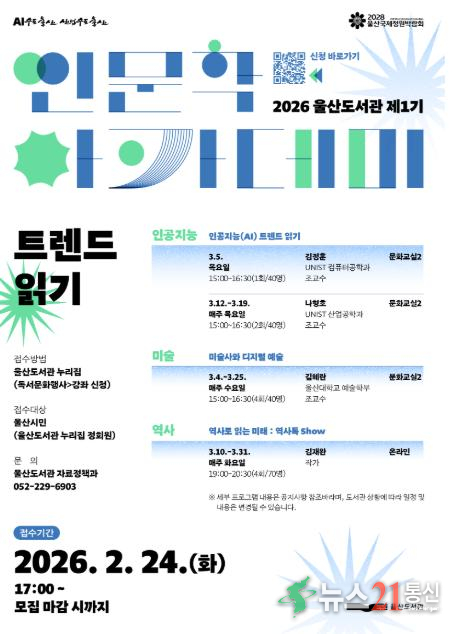 울산도서관은 오는 3월부터 ‘2026년 제1기 인문학 아카데미’를 운영한다고 밝혔다. 이번 강좌는 기존 수강생 등 시민의 의견을 반영해 「유행(트렌드) 읽기」를 주제로 ‘인공지능’, ‘미술’, ‘역사’ 등 3개 분야로 구성된다. ▲인공지능 분야에서는 ‘인공지능(AI) 유행(트렌드) 읽기’ 강좌가 3월...
