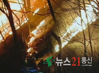 경남 함양군 지역에서 산불이 발생해 진화 작업이 진행 중이다. 몰아치는 강풍에 작은 불티도 함께 휘날리며 불길이 순식간에 번졌다.