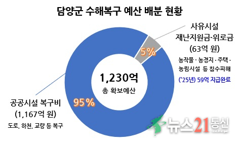 [뉴스21 통신=이준범 ]담양군이 지난해 7월 발생한 극한 호우 피해 복구를 위해 확보한 1,230억 원 규모의 예산 운용 현황을 투명하게 공개했다. 이는 최근 ‘군민과의 대화’에서 제기된 주민들의 궁금증을 해소하고, 복구 사업의 신뢰도를 높이기 위한 선제적 소통 행보로 풀이된다.담양군은 지난해 특별재난지역 선포를 통해 총 1,230억...