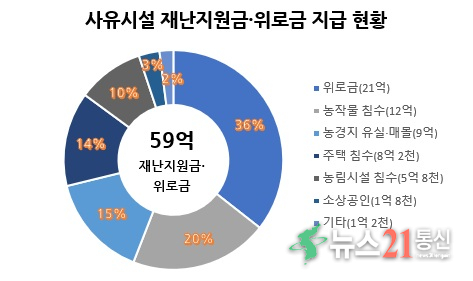 주요 항목: 위로금(21억), 농작물 침수(12억), 농경지 유실(9억), 주택 침수(8.2억), 소상공인(1.8억) 등