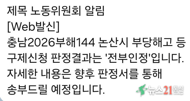 노동 문제 역시 법적 판단으로 이어졌다. 지방노동위원회는 3월 26일 열린 심의에서 ‘충남 2026부해 144 논산시 부당해고 구제신청’ 사건에 대해 ‘전부 인정’ 결정을 내린 것으로 확인됐다. 구체적인 판정 사유는 향후 판정서를 통해 공개될 예정이다.
