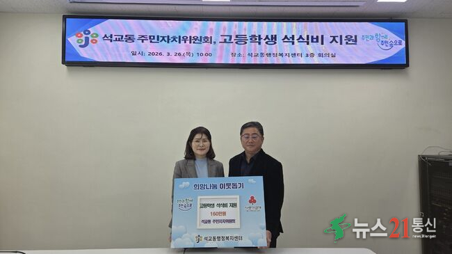 석교동 주민자치위원회, 취약계층 고등학생 석식비 지원- 지역사회와 함께하는 따뜻한 나눔 실천 -대전 중구 석교동(동장 강민서)은 석교동 주민자치위원회(위원장 정태일)에서 지역 내 취약계층 고등학생을 대상으로 ‘석식비 지원 사업’을 지속 추진한다고 밝혔다.이번 사업은 지난 2024년부터 주민자치위원회 위원들이 십시일반 ..